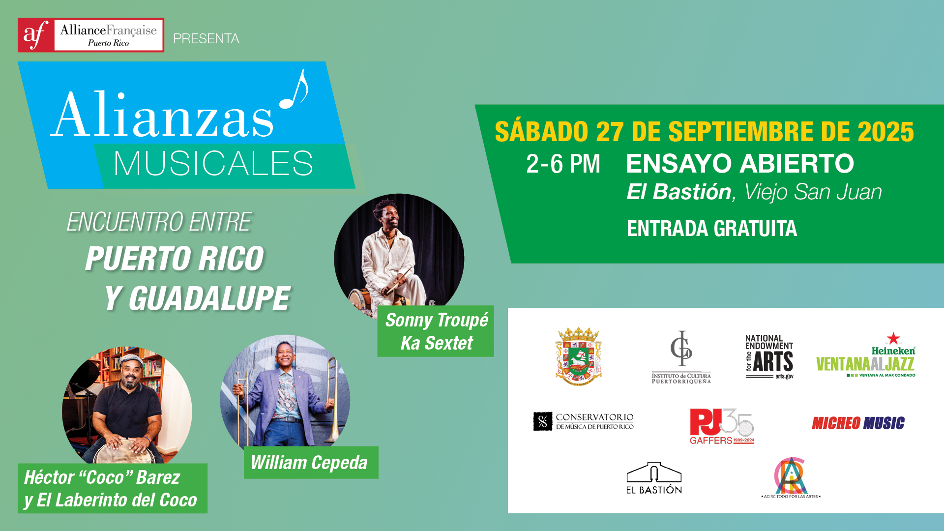 Este proyecto presenta a tres referentes del jazz caribeño y la música tradicional: Sonny Troupé, William Cepeda y Héctor “Coco” Barez, quienes colaborarán en una experiencia artística única que une a Guadalupe y Puerto Rico. Esta iniciativa entrelaza el gwo ka guadalupeño, la bomba puertorriqueña y el jazz, buscando fortalecer el diálogo cultural entre Puerto Rico y Guadalupe, y resaltar nuestra herencia afrocaribeña común.