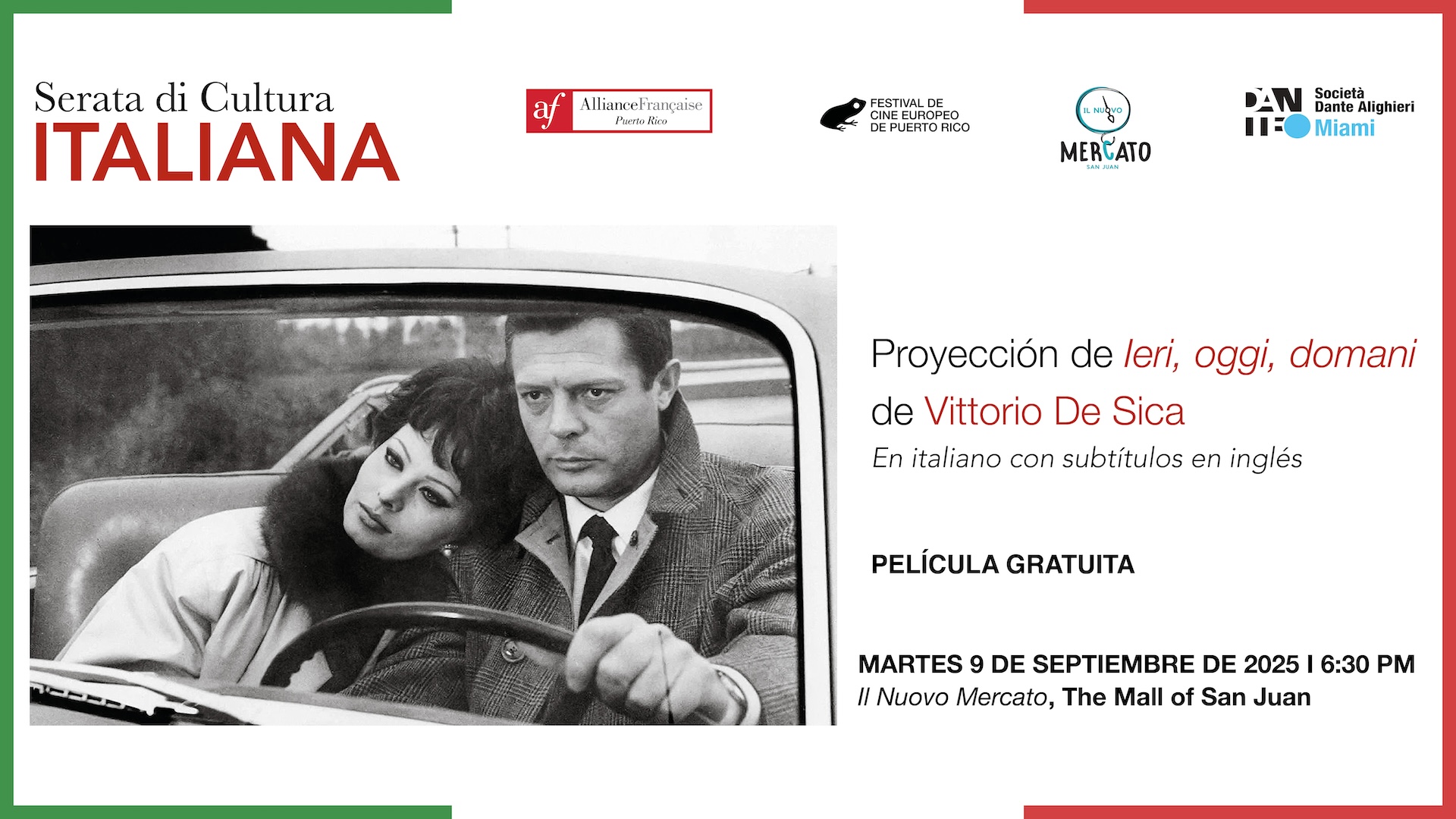 El martes, 9 de septiembre a las 6:30 PM en colaboración con la Società Dante Alighieri di Miami, disfruta de una proyección gratuita de la película italiana Ieri, oggi, domani (Ayer, hoy y mañana) de Vittorio De Sica. En el ambiente único de Italia en Il Nuovo Mercato. Participa de una noche especial para celebrar el cine, el idioma y la tradición cultural italiana.