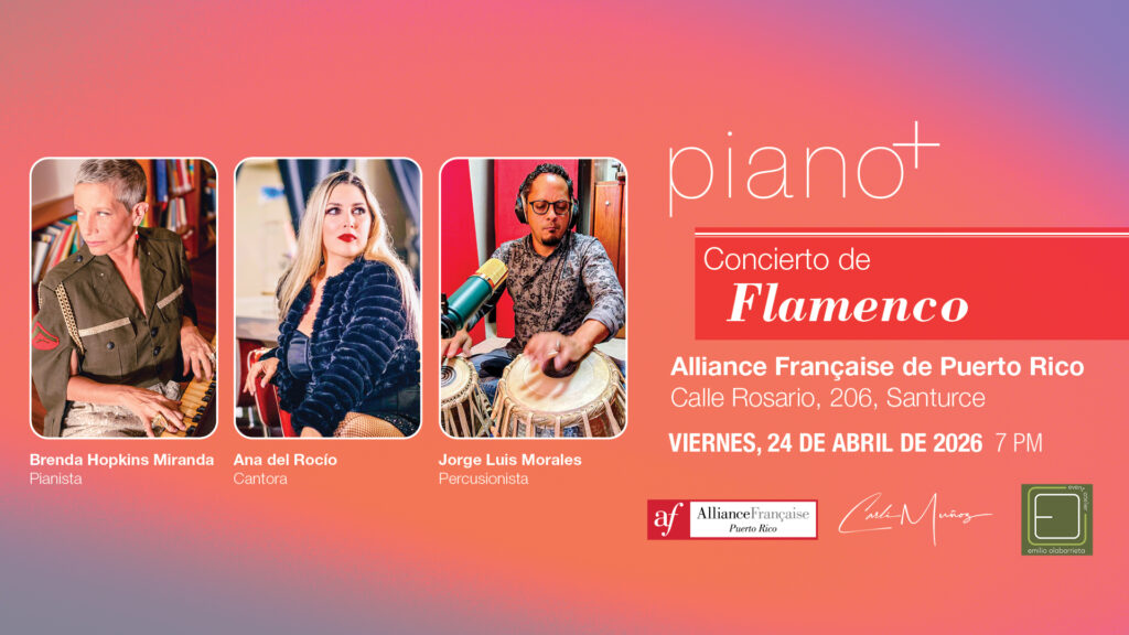 En la edición de abril de Piano+ celebramos un concierto de música folclórica española, donde grandes artístas reconocidos del país como Brenda Hopkins Miranda, Ana del Rocío y Jorge Luis Morales te harán sentir la pasión, la fuerza y el ritmo del flamenco. Brenda Hopkins Miranda es una pianista, compositora y productora puertorriqueña, reconocida por su estilo ecléctico y su fusión de influencias multiculturales. Ha llevado su música a escenarios internacionales y colaborado con destacados artistas. BOLETOS Entrada regular: $30 -…