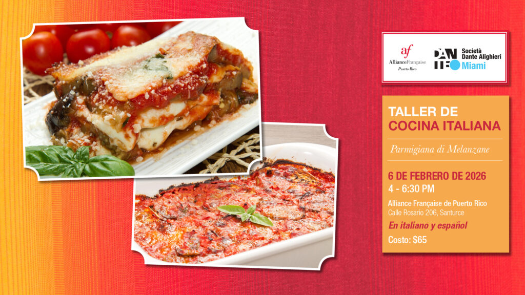 El viernes, 6 de febrero de 4-6:30 disfruta del último taller con la nonna. Prepara una deliciosa Parmigiana di Melanzane (berenjena a la parmesana) en la cocina de la AFPR. Viernes 6 de febrero de 2026 - 4-6:30 PM Alliance Française Puerto Rico Calle Rosario 206, Santurce Costo: $65 | En italiano y español Contáctanos al 787-722-3174 de lunes a viernes.