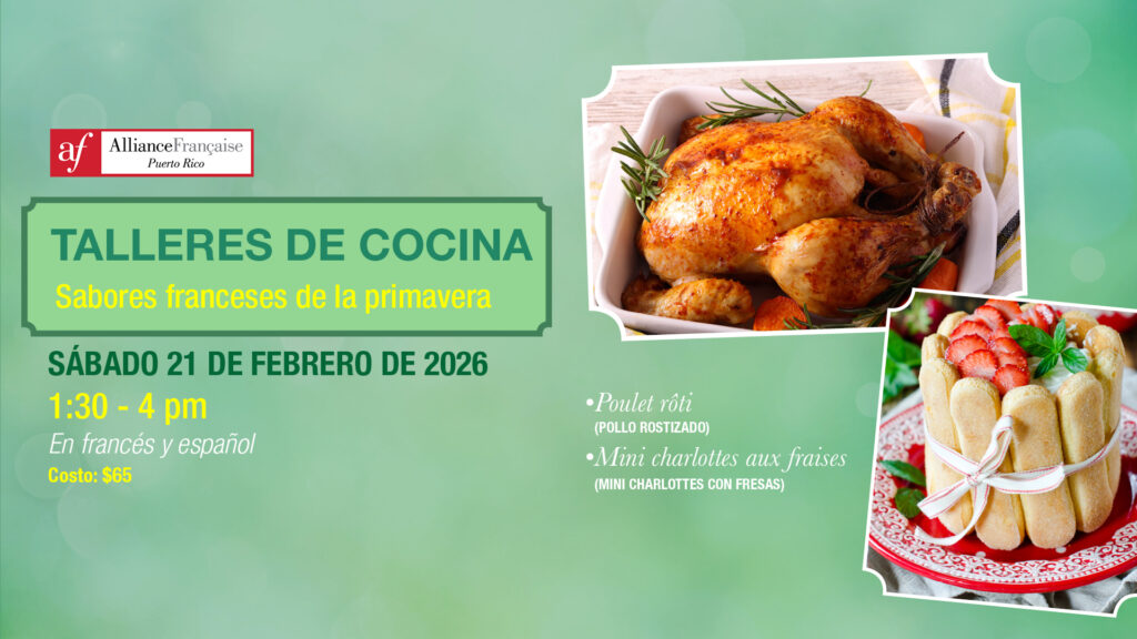 Este febrero ven a compartir junto a nosotros tu amor por la cocina. El sábado 21 de febrero ofreceremos un taller de cocina para compartir en familia, pareja o amigos. Podrás preparar un poulet rôti aux herbes de provence (pollo rostizado con hierbas provenzales) acompañado de une purée à la française (puré de papas a la francesa). Complementa tu paladar con mini charlottes aux fraises (mini charlottes de fresas con crema). . Sábado 21 de febrero de 2026 -…