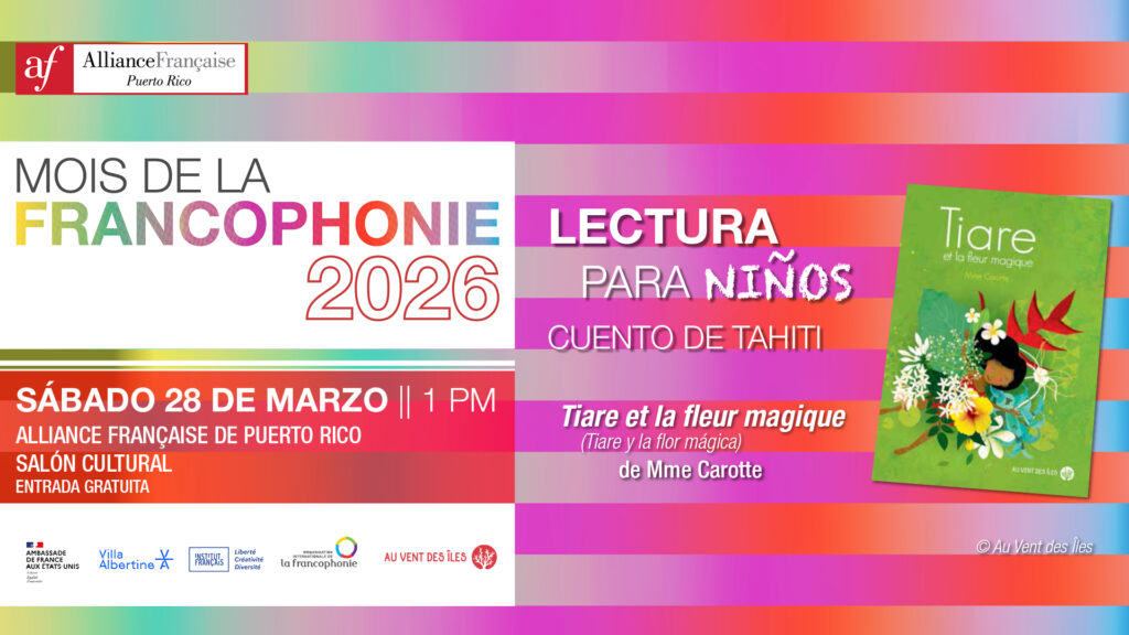 ¡El próximo sábado 28 de marzo a la 1:00pm, ven con tus niños a descubrir el mundo de las flores polinesias en este evento especial! En colaboración con la editorial Au Vent des Îles en la Polinesia Francesa, nos complace presentar una lectura en francés del libro infantil Tiare et la fleur magique (Tiare y la flor mágica) de la autora Orane Desmarty, conocida como Mme Carotte. Además de la lectura, los participantes descubrirán algunas de las bellas flores…